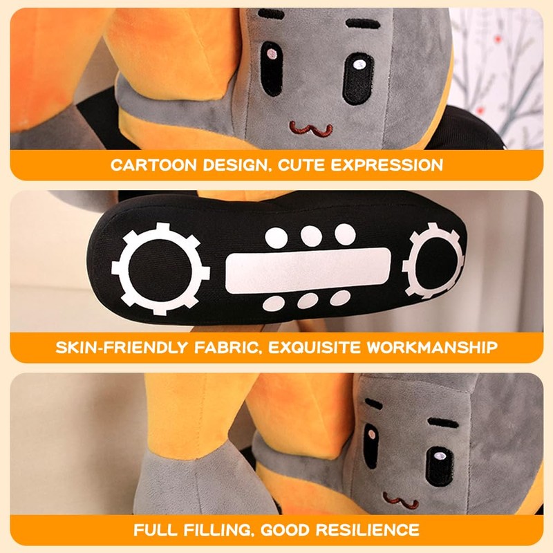 - FUN EXCAVATOR DESIGN With its fun and playful design of a yellow body, black wheels and a grey shovel, is very appealing. Children's plush excavator toy cute appearance and its soft touch can keep you in a happy mood all day long