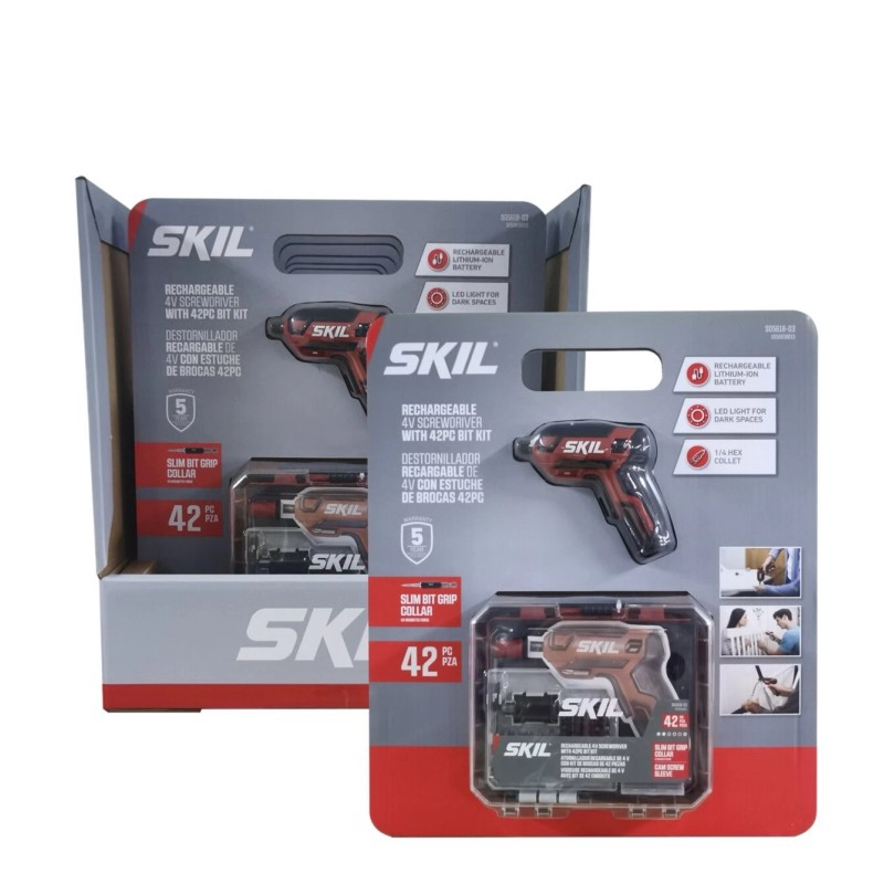 The SKIL 4V Pilot Screwdriver with 42-Pc. Bit Kit Case is perfect for DIY projects around the house. Whether it’s putting together ready-to-assemble furniture (RTA), tightening hinges or any task that's thrown your way, the SKIL 4V screwdriver will do just that. The pistol grip handle delivers versatility with a simple twist to fit into tight spaces, while the LED light offers precision in dimly lit areas and the cam screw sleeve provides quick and easy support for furniture assembly. Every home needs a go-to rechargeable screwdriver–and this one checks all the boxes.
