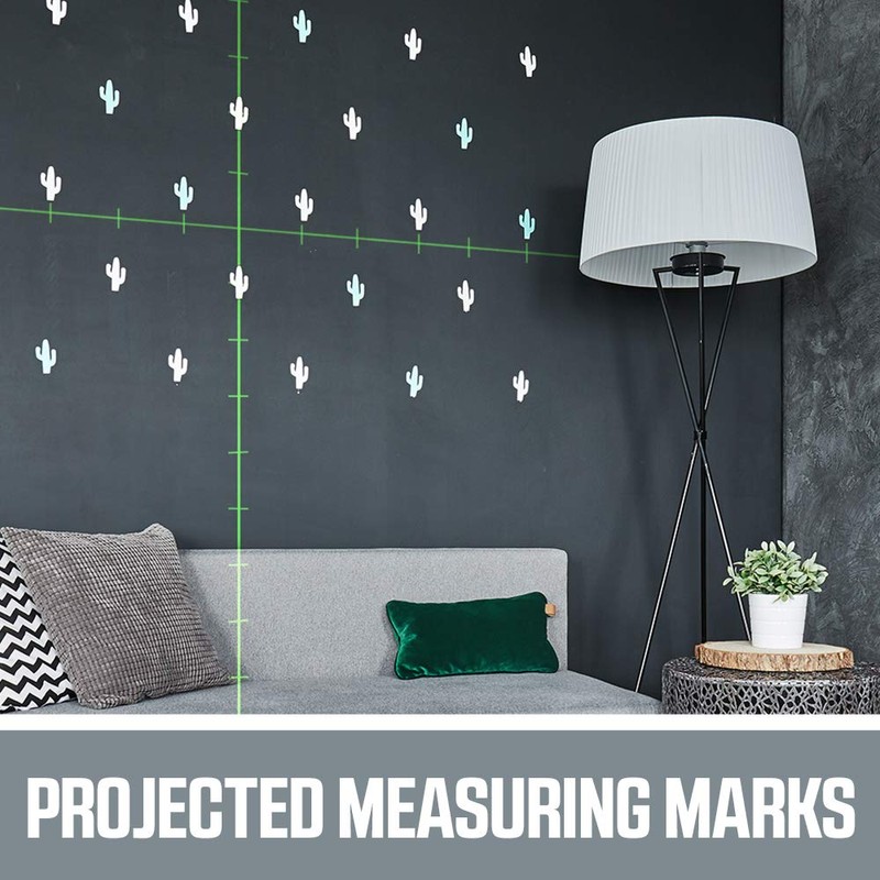 - Projected measuring marks cross the horizontal and vertical lines at even intervals and make it easy to tackle jobs that require equal spacing—like Painting stripes or installing multiple pictures, hooks, or shelves. You can easily change the spacing by moving the tool closer or further away.