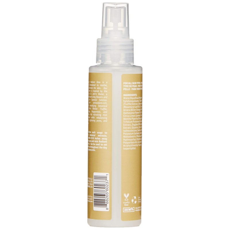 Truffle Therapy@ Radiant Dew is a hydrating mist formulated to soothe, protect, and illuminate the skin. Our glow-inducing tonic is inspired by the Italian legend of St. John's Water, a magical dew produced using flowers and herbs during the Summer Solstice. Enhanced with antioxidant-rich, soothing, and detoxifying botanical extracts of Black Winter Truffle, Rosemary, Ginger, Peppermint, and Damascena Rose, this refreshing mist increases radiance while rebalancing skin's pH level, tightening pores, and setting makeup.