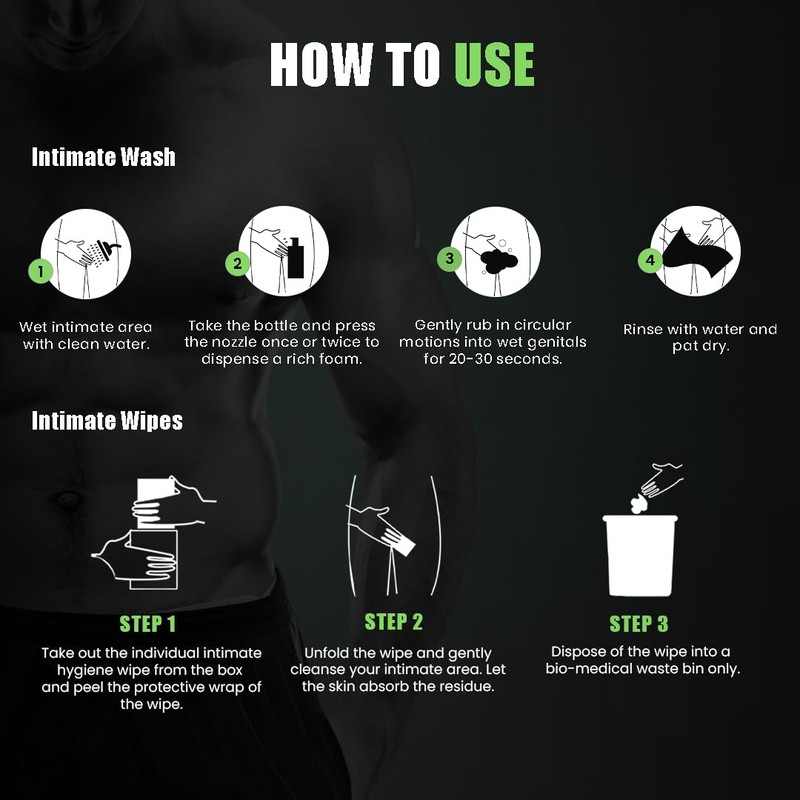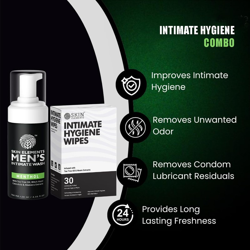 Skin Elements Intimate Hygiene Combo, Intimate Wash Men 120 ml with Menthol + 30 Wipes with Tea Tree & Neem Extracts - Ph Balanced Foaming Wash, Prevents Irritation & Odor