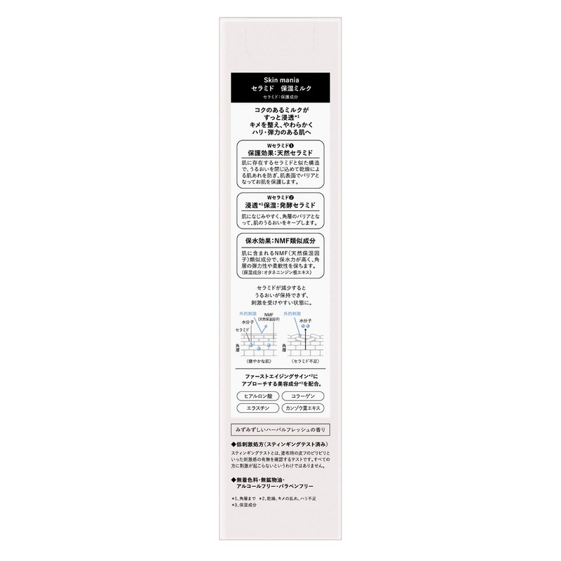 - 【Skin maniaとは】ときどき敏感肌・乾燥肌などの肌悩みに寄り添う、肌へのやさしさにこだわったスキンケアブランド。基本ケアからベースメイクまで、すべてのラインナップに天然セラミドと発酵セラミドのWセラミドを配合し、トータルにスキンケアをサポートします。(セラミド:保護成分)