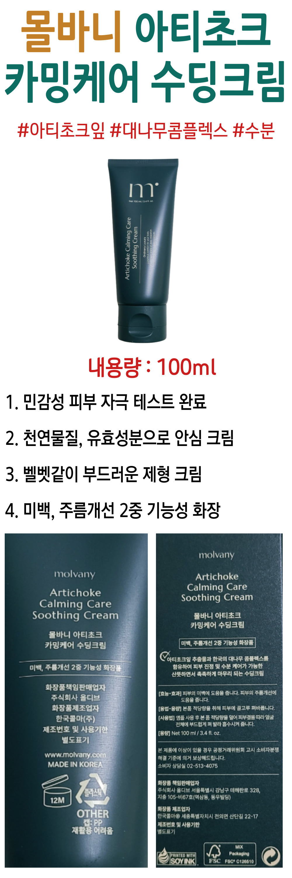 피부 미백 주름 몰바니 아티초크 카밍케어 수딩크림 진정 천연물질 벨벳 대나무 톤업 화이트닝 얼굴 톤 주