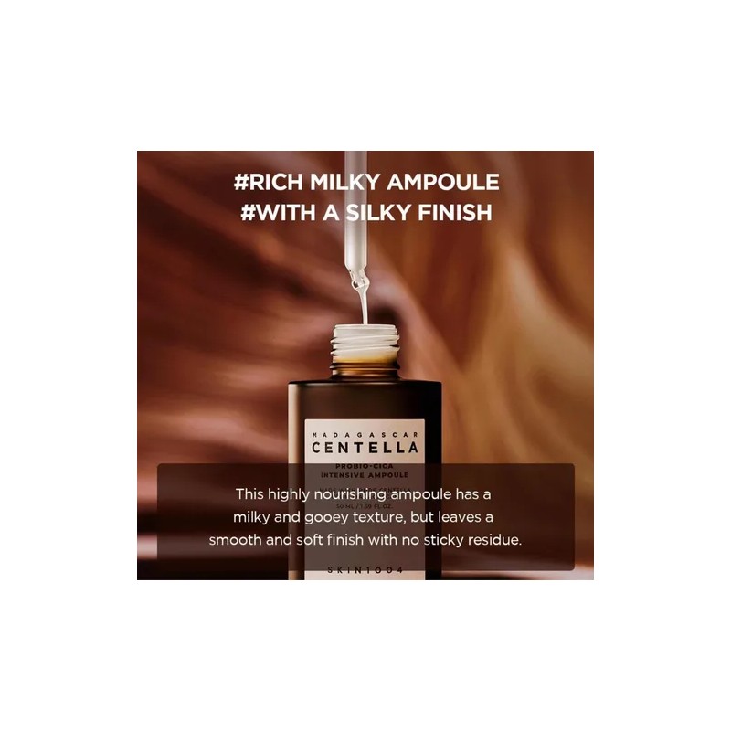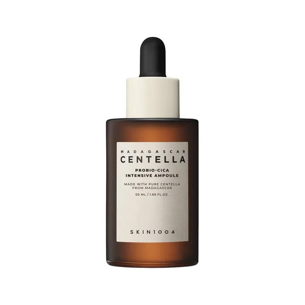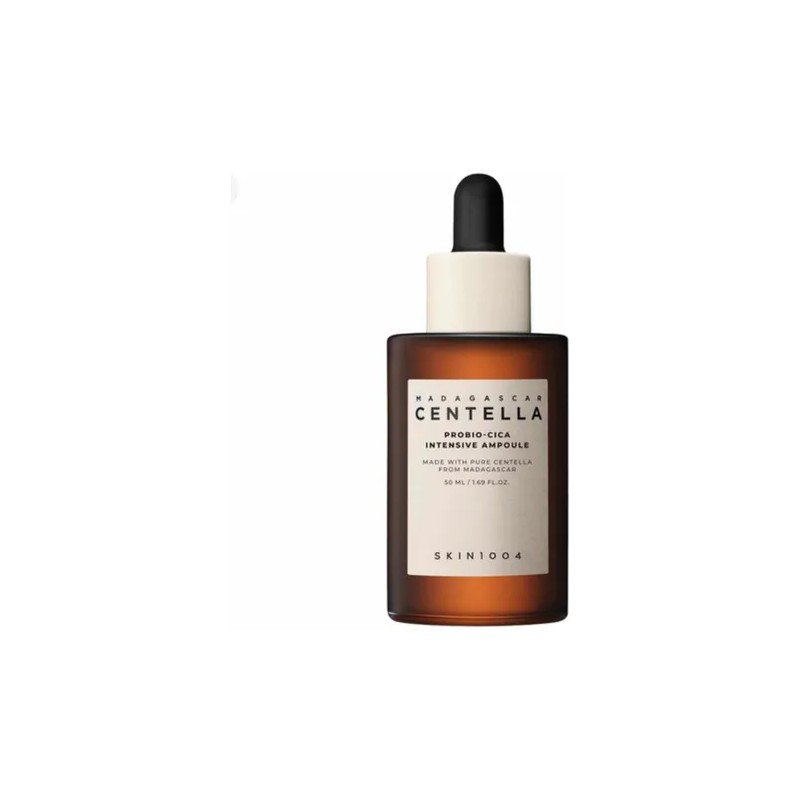 La ampoule intensiva SKIN1004 Madagascar Centella Probio-Cica enriquecida con Cica fermentada y ceramidas, alivia las imperfecciones, reduce el exceso de producción de grasa, disminuye la apariencia de manchas ó hiperpigmentación, proporciona una hidratación profunda y fortalece la barrera de la piel.