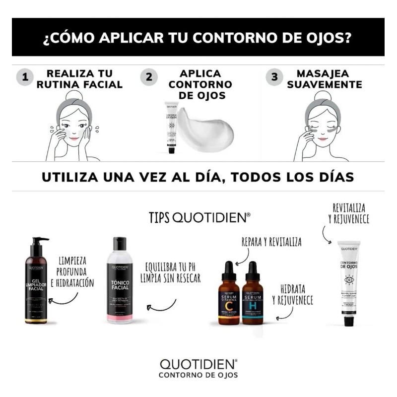 El Contorno de Ojos Quotidien es un gel renovador de uso diario, adecuado para todo tipo de pieles. Con múltiples beneficios para una mirada radiante, combina Jazmín de Arabia, Espino Blanco y Extracto de Ginkgo Biloba con propiedades antiinflamatorias e hidratantes. Contribuye a reafirmar los párpados, reducir líneas de expresión y arrugas, dejando el contorno de ojos suave, firme y lleno de vitalidad. Su textura ligera y de fácil absorción trabaja desde las capas más profundas, siendo un complemento ideal en la rutina diaria de cuidado facial.