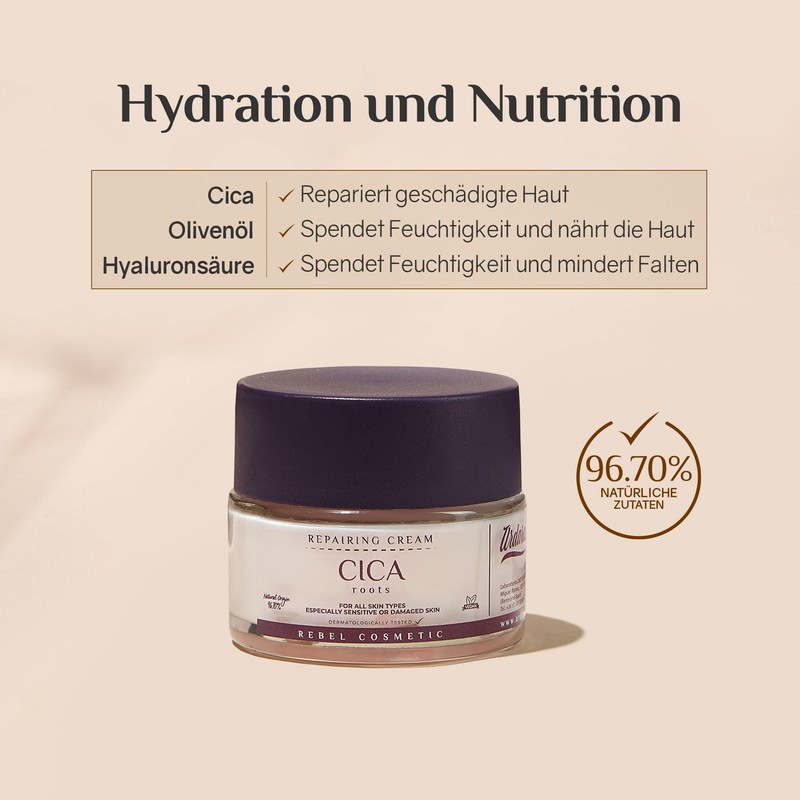 - VERBESSERTE FORMULIERUNG: Wir verstärken die Wirksamkeit von Cica, indem wir unsere Formeln mit Hyaluronsäure, die die Haut intensiv mit Feuchtigkeit versorgt, und Niacinamid, das die Hautstruktur verbessert, anreichern