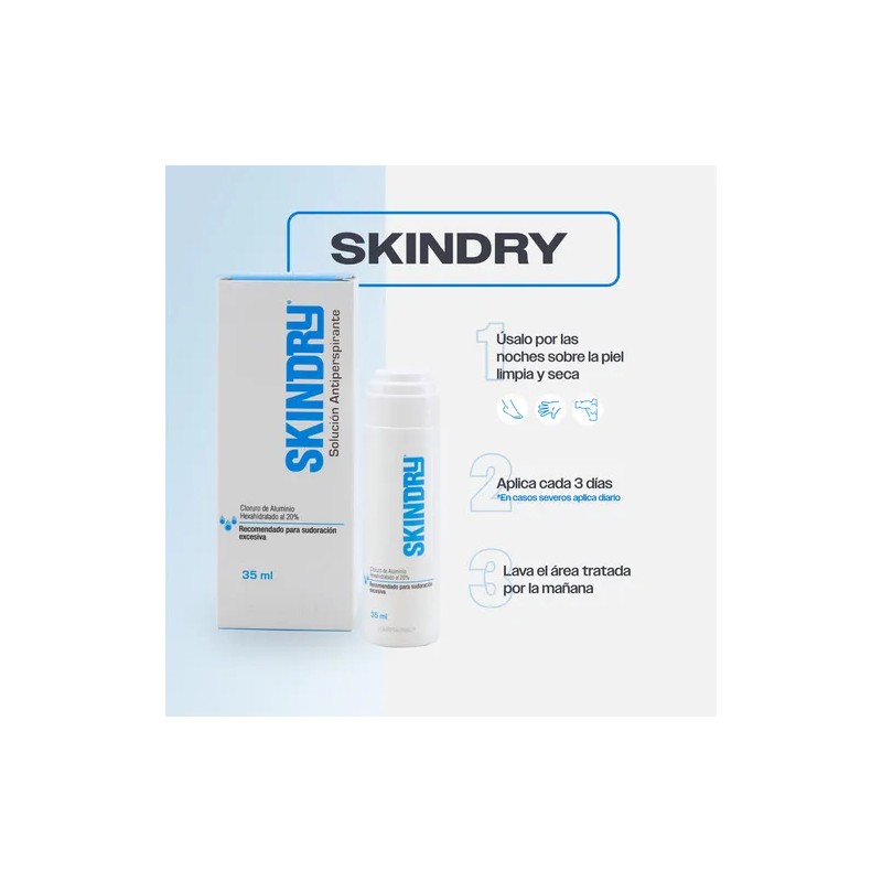 Skindry es un antiperspirante con efecto secante de uso tópico, indicado en el control de la sudoración de moderada a severa, en zonas como: axilas, palmas de las manos, espalda, cuero cabelludo y plantas de los pies.