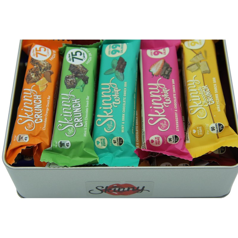 Skinny Bars Whip and Crunch x 15 Mixed Flavours - Low-Calorie Snack Hamper all Under 100 Calories Bundle with Rainbow Gifts Silver Window Lid Refillable Tin