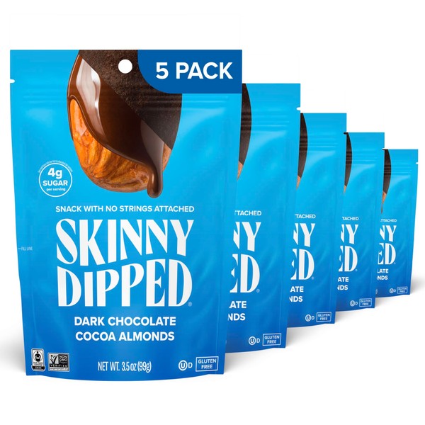 SkinnyDipped Dark Chocolate Cocoa Almonds, Healthy Snack, Plant Protein, Gluten Free, 3.5 oz Resealable Bags (Pack of 5)