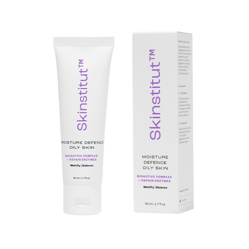 Skinstitut Oily Skin Moisture Defence 50ml is a lightweight, mattifying daily moisturizer that minimizes shine, fortifies skin, and balances excess sebum production.