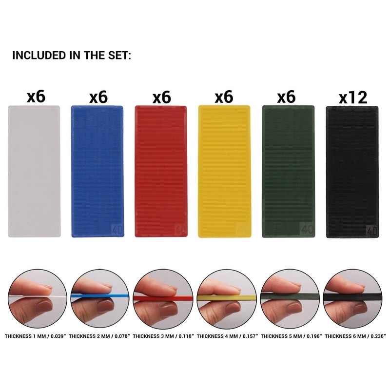 - The package contains shims of different thicknesses: 6 pcs x 1 mm (White), 6 pcs x 2 mm (Blue), 6 pcs x 3 mm (Red), 6 pcs x 4 mm (Yellow), 6 pcs x 5 mm (Green) and 12 pcs x 6 mm (Black). Rectangular shape. Total 42 shims.