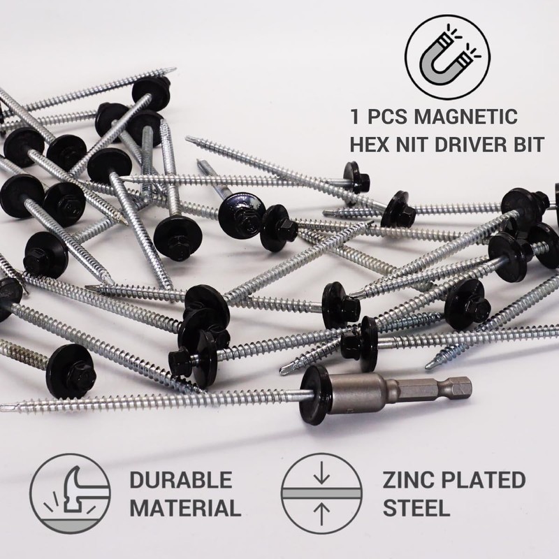 SKIR'CO (Pack of 10) Painted Roofing Screws 4.8 x 100 mm, Hex Head Self Drilling Screws with EPDM Washers (Deep Black, RAL 9005)