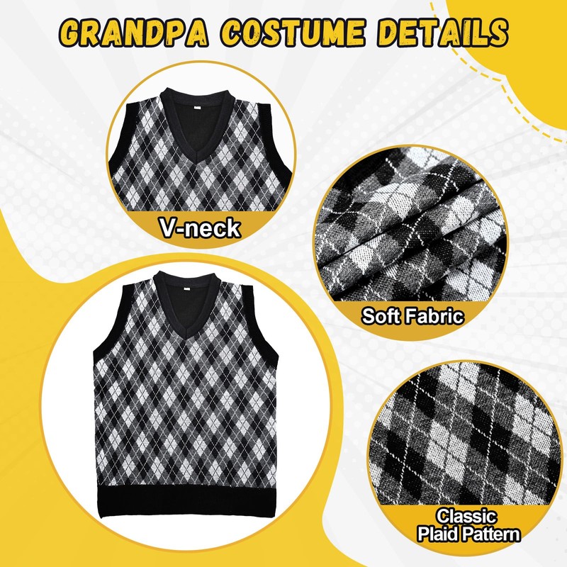 - 【Authentic Grandpa Transformation with Easy-to-Wear Accessories】 This boys' old man costume includes adhesive mustaches, eyebrows, and a slim-fit sweater vest that effortlessly create a realistic aged appearance. Combined with the classic hat and glasses, it delivers a charming and lifelike grandpa look, perfect for making any celebration unforgettable.