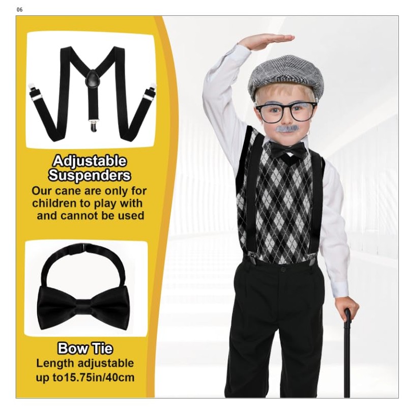 - 【Complete Old Man Costume Set for Kids】 This all-inclusive kids old man costume features essential accessories like a classic newsboy hat, V-neck sweater vest, glasses, mustache and eyebrows set, cane, bow tie, wrinkle stickers, magnifier, and Y-back suspenders. Perfect for creating a charming grandpa look for 100 Days of School celebrations or any special occasion.