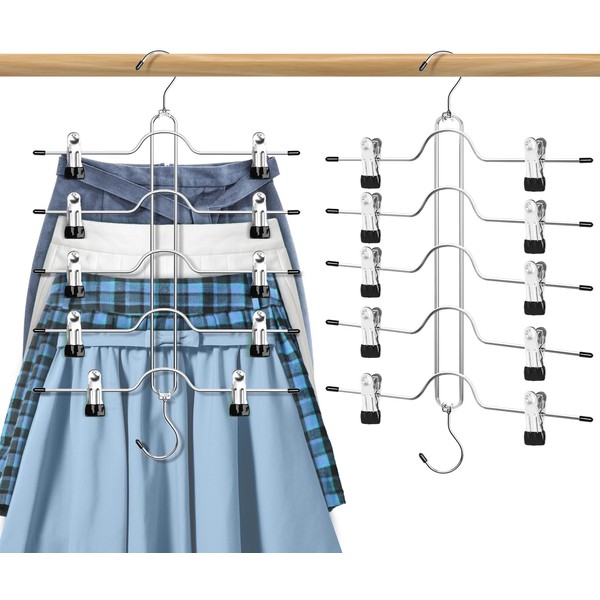 Skirt Hangers with Clips, 5 Tier Pants Skirt Hangers Space Saving Multi Shorts Hangers with Adjustable Clips 2 Pack