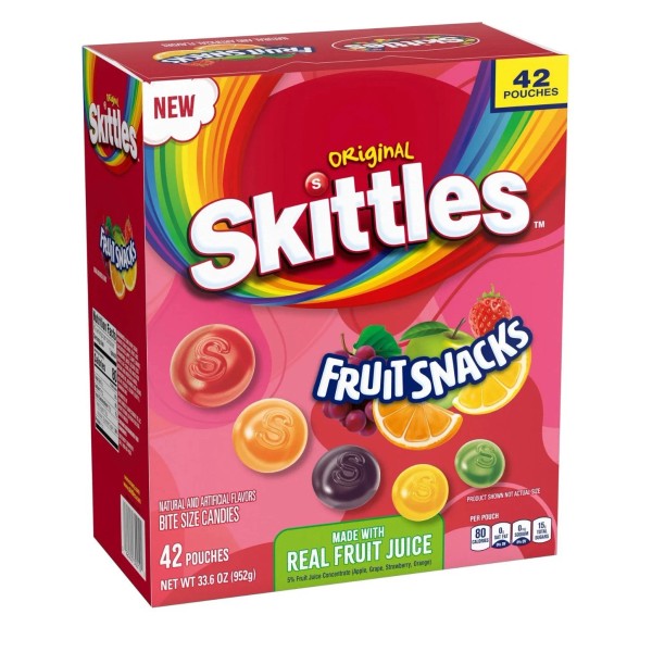 The product is Skittles Fruit Snacks in its original flavor, containing real fruit juice gummies. Each pack has 42 gummies weighing 0.8 oz.These candies are perfect for snacking on-the-go or adding to snacks and treats. The Skittles brand ensures high-quality and delicious flavor, making them a popular choice for those who love fruity and sweet snacks.