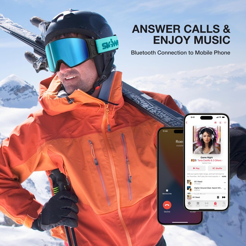 - Answer Calls & listen to Music - With built-in microphone and speaker systems, our smart anti fog ski goggles transform your skiing experience. After pairing with Bluetooth, you can listen to your favorite tunes, adjust the volume on the go, and effortlessly answer phone calls with a single tap. The noise-reduction feature ensures you enjoy clear audio while keeping your hands free, which not only boosts your enjoyment but also enhances safety on the slopes.