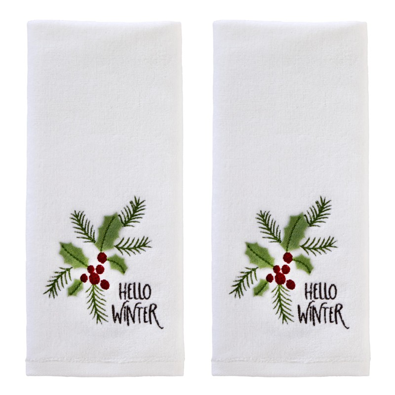 SKL Home Christmas Hello Winter Holly 3D Hand Towel 2pc Set for Bath/Kitchen/Bar & Gift, White