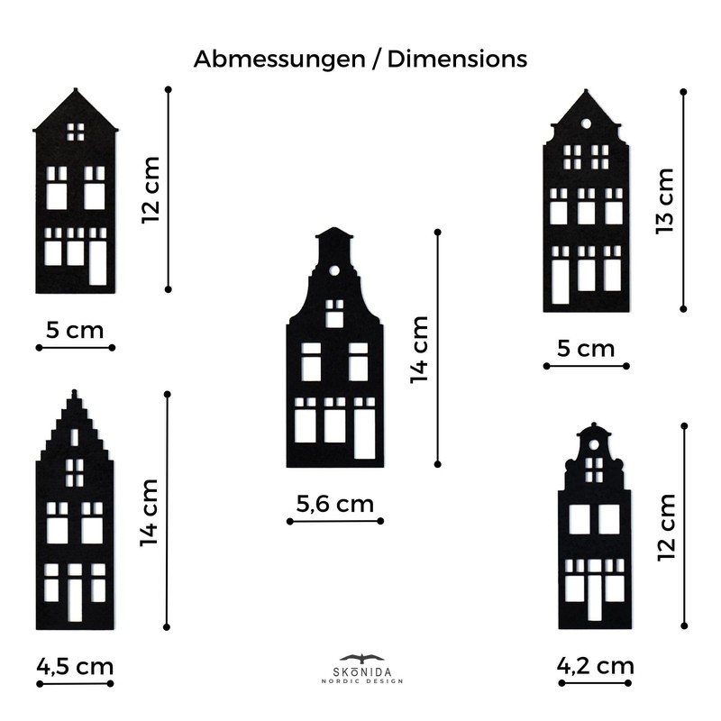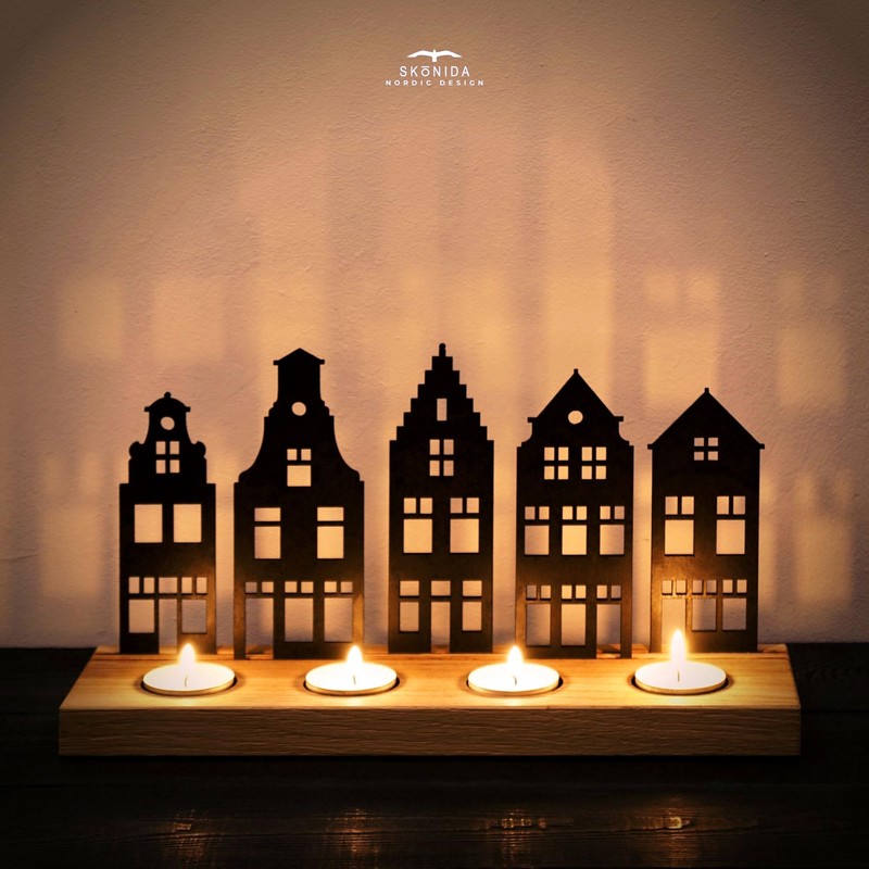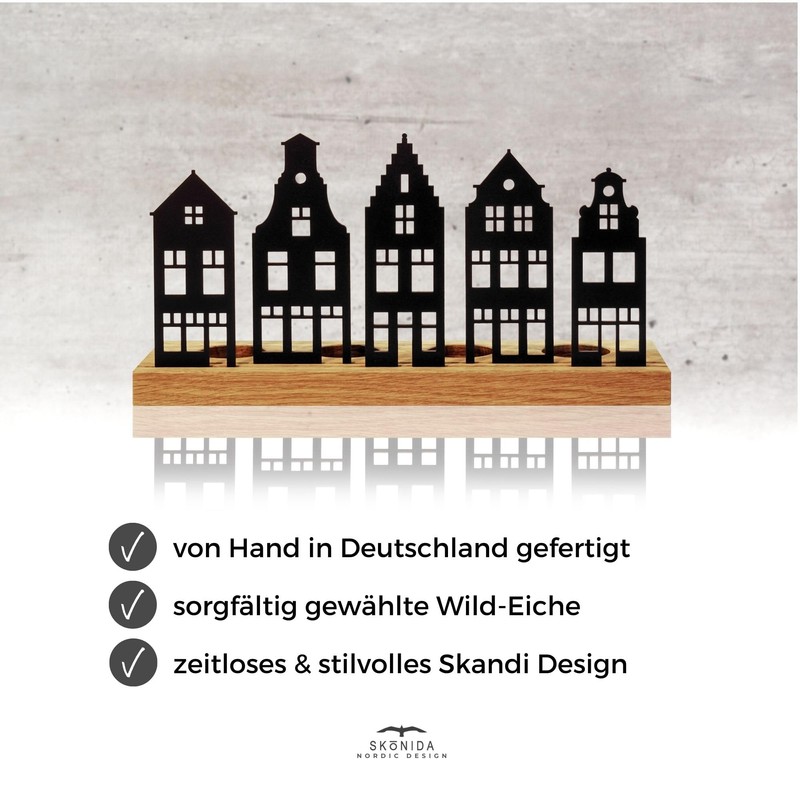- Features - Material: natural wild oak wood, underside: with Skonida engraving, dimensions of wooden tea light holder: approx. 30 x 9 x 2 cm. Dimensions of houses (see pictures). Height max. 14 cm, width max. 5.6 cm. Box contents: 1 x tea light wooden stand, 5 x houses made of wood material, black