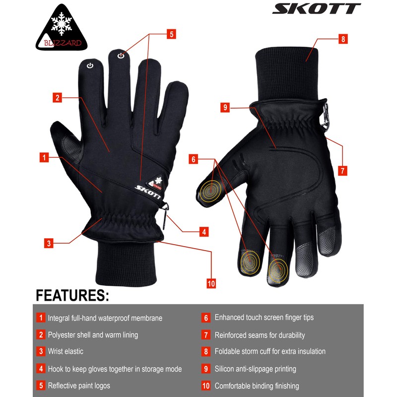 - MULTI-PURPOSE GLOVES: The Skott Blizzard gloves are made for multi-activity use. The unisex design is perfect for both women and men, and the winter gloves can be used for cycling, riding, hiking, driving, skiing, motorcycle riding, biking, running, climbing, snowboarding, or simply shoveling snow in the wintertime. These thermally insulated fleece gloves are a must winter accompany for outdoor working or sports