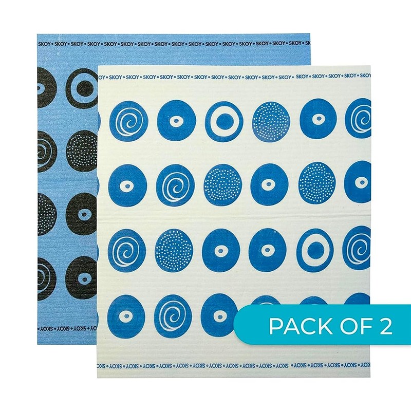 - Washable & Reusable: The reusable cloth is dishwasher safe & washer/dryer safe. It can also be cleaned in a microwave to rid it of bacteria. Pack of 2 Skoy Cloths, Blue cloth with black circles & White cloth with blue circles