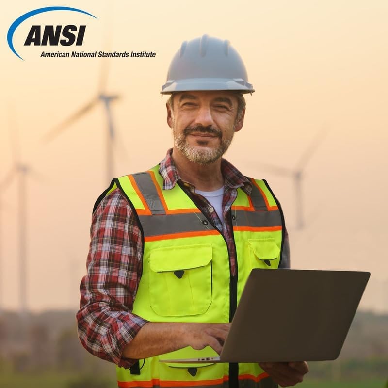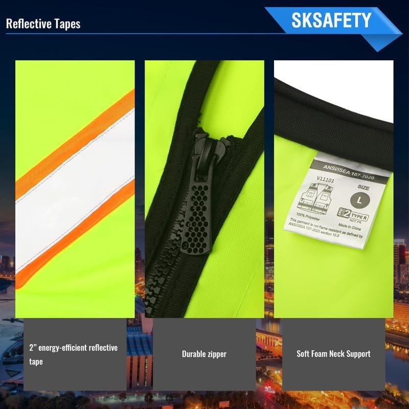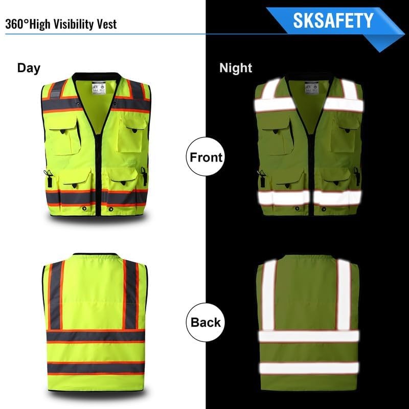 - SKSAFETY 10 Pockets Professional level Safety Vest, Class 2 High Visibility Security Vest with Zipper, Hi Vis Vest with Reflective Strips, ANSI/ISEA Standard, Construction Work Vest
