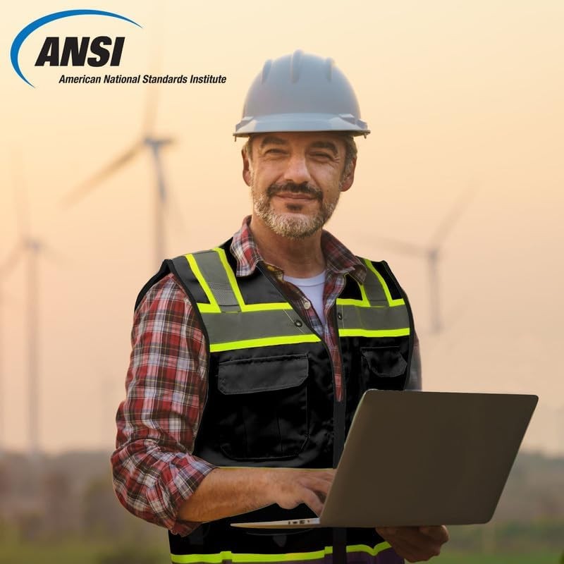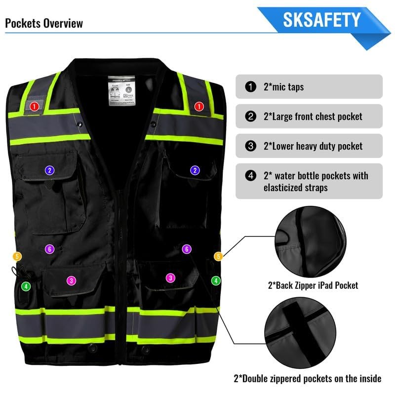 - SKSAFETY 10 Pockets Professional level Safety Vest, Class 2 High Visibility Security Vest with Zipper, Hi Vis Vest with Reflective Strips, ANSI/ISEA Standard, Construction Work Vest
