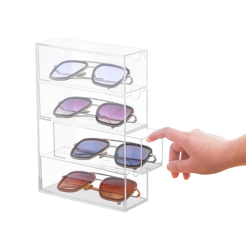 1. Featuring four spacious drawers, this clear display case offers the perfect solution for storing and protecting your favorite sunglasses and eyeglasses;