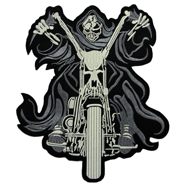 Skull Biker Back Patch XXL Back Patch Large Iron-On or Sew On for Cowl Jacket Vest Iron-On Patch Grim Reaper Skeleton Motorcycle Rider Patch Size 21.5 x 25.5 cm