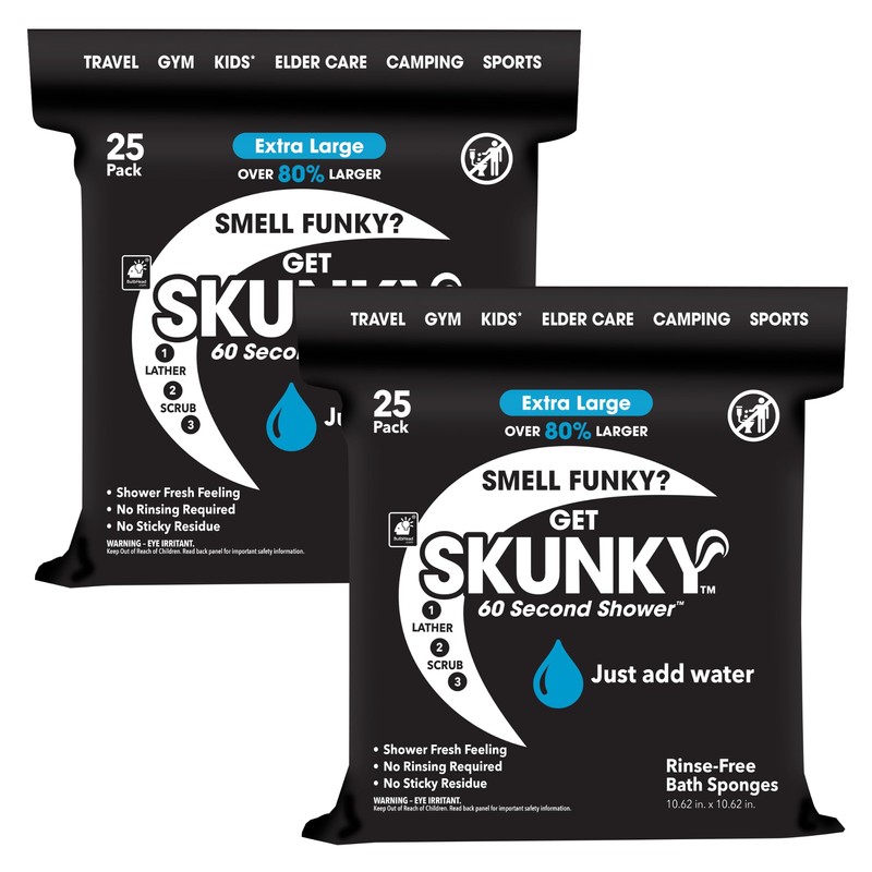 - Smell funky? Get Skunky! These XL rinse-free bathing wipes help get you clean in 60 seconds without stepping into a shower ideal for gym, camping, travel, kids, elder care, sports, & more.