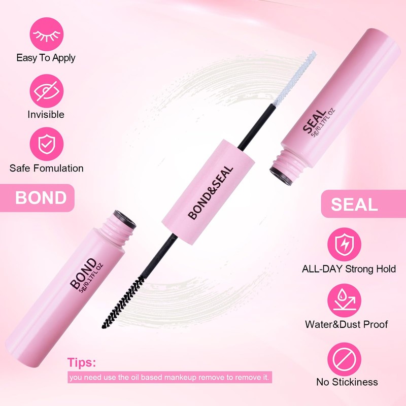 - Application: Apply lash bond to your natural lashes and wait about 15 s ; Grasp the base of the eyelash clusters and gently remove the lashes from the lash strip; Then apply lash clusters under natural lashes; As the final step, apply an appropriate amount of sealing liquid to the root of the eyelashes for a long-lasting effect.