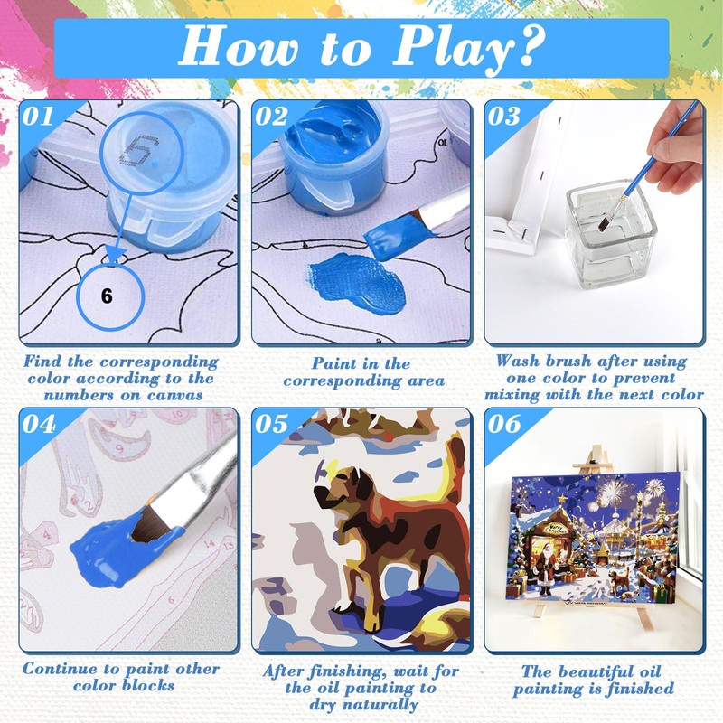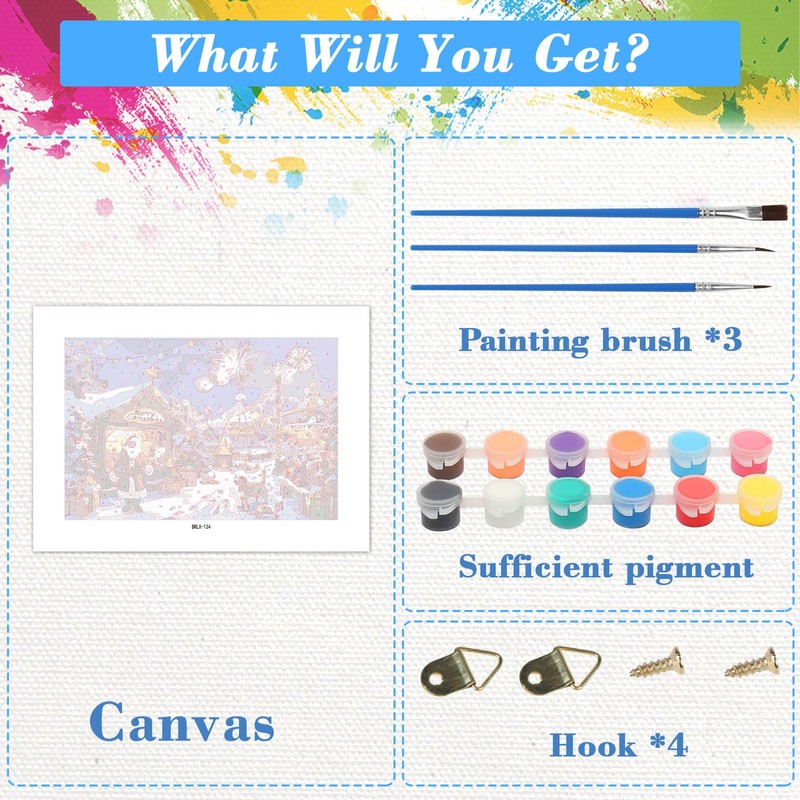 • What You Will Get: Each paint by number kit includes a wooden frame canvas, and 3 brushes with different tips. Hang their masterpiece with ease using the included Hooks or Self Adhesive Dots for stunning wall decor