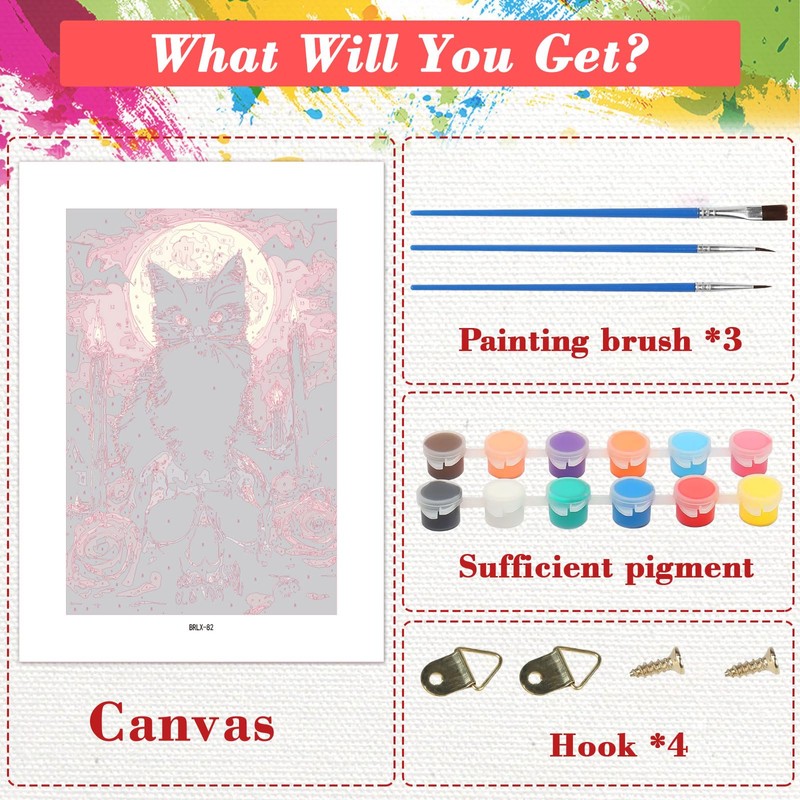 - What You Will Get: Each paint by number kit includes a wooden frame canvas, and 3 brushes with different tips. Hang their masterpiece with ease using the included Hooks or Self Adhesive Dots for stunning wall decor