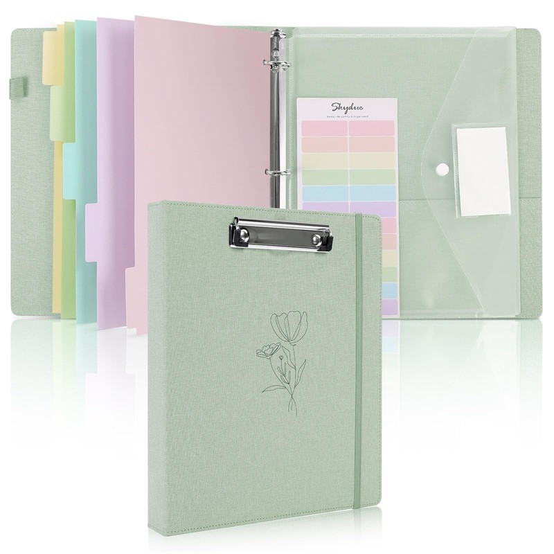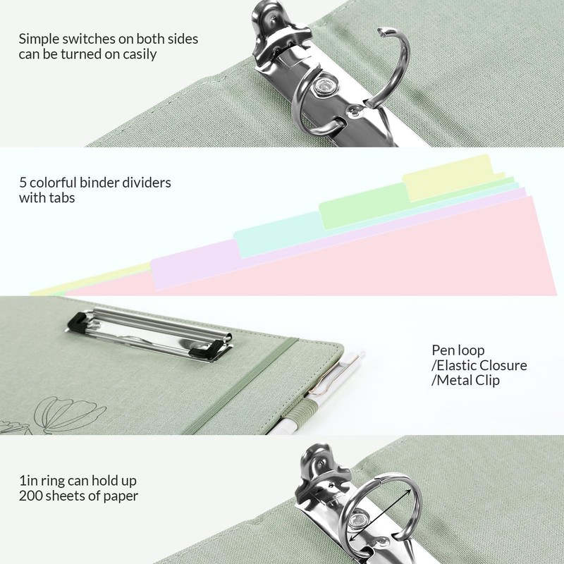SKYDUE 3 Ring Binder with Clipboard,1 Inch Linen Binder for 3 Hole Punch Letter Size Loose Leaf Paper with 5 Dividers, Pocket and Labels School and Office Supplies-OliveGreen