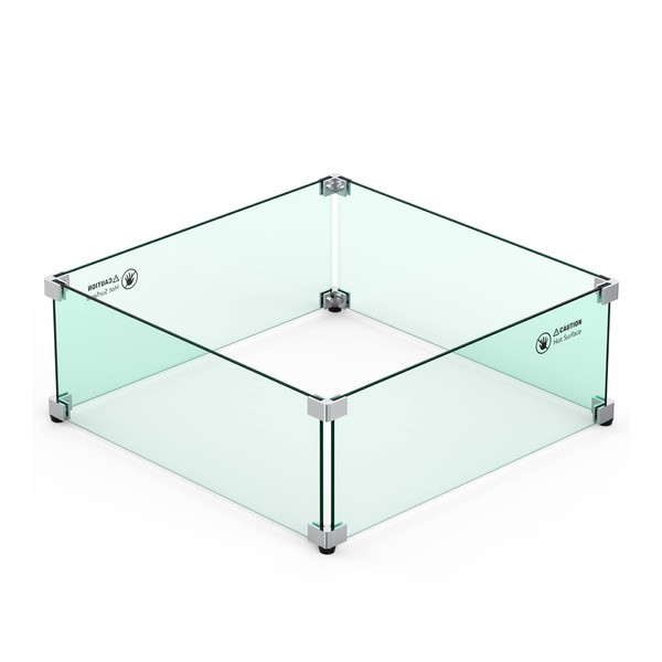 - Dimension - The glass windshield for fire pit measures 18" x 18". It is recommended to have a 2.5" clearance between your fire pit opening and the wind guard for optimal performance.