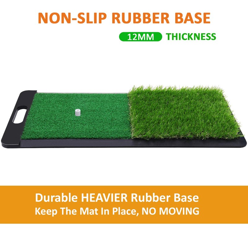 - ● NON-SLIP HEAVY & DUARABLE RUBBER BASE: Thicker & heavy base has strong grip. So there is NO moving on all surfaces when you practice hitting, driving, chipping, and putting. Designed for indoor and outdoor use. Don't worry about weather conditions. Best choice for instructors and players.