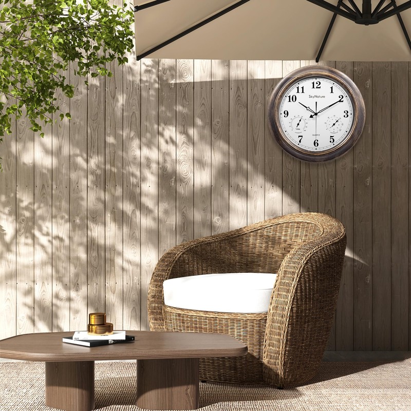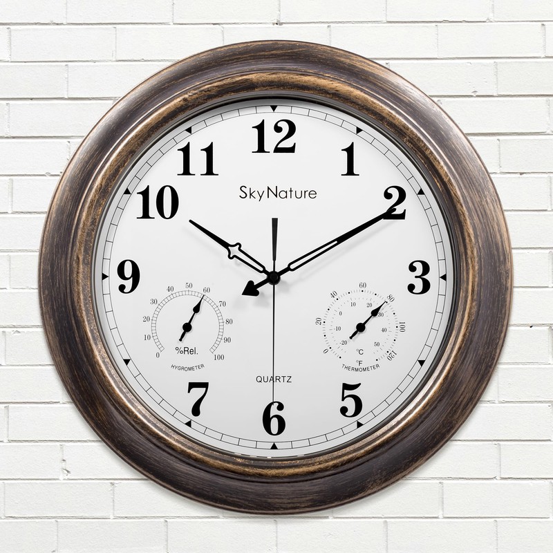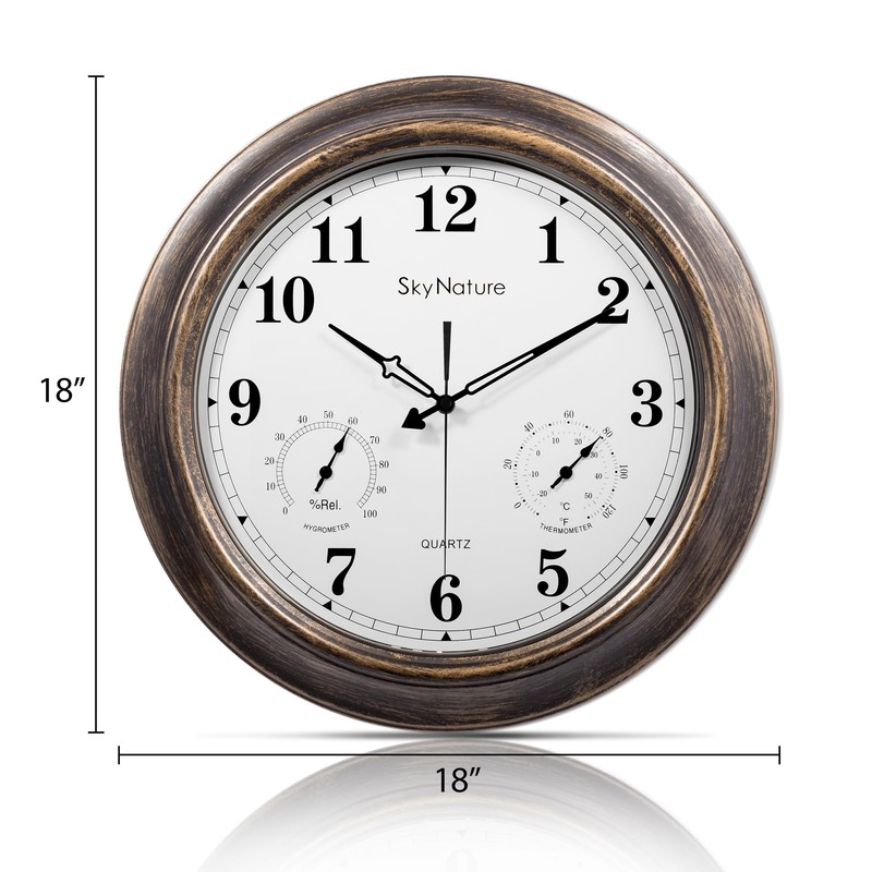 - ANALOG HYGROMETER & THERMOMETER - The SkyNature 18 inch outdoor clock measures temperatures from -10 to 130 degrees Fahrenheit,and Humidity readings from 0% to 99% RH