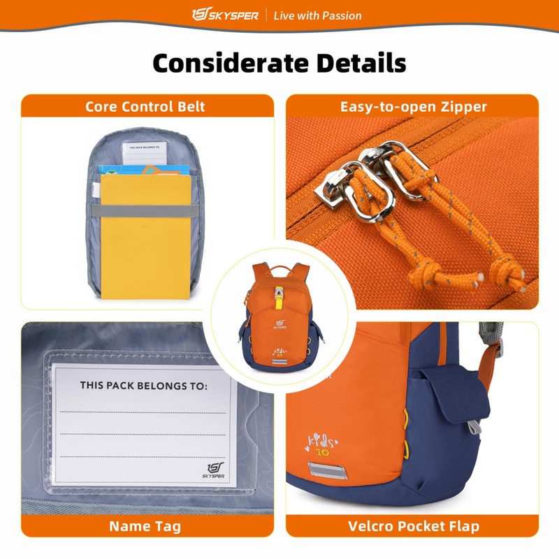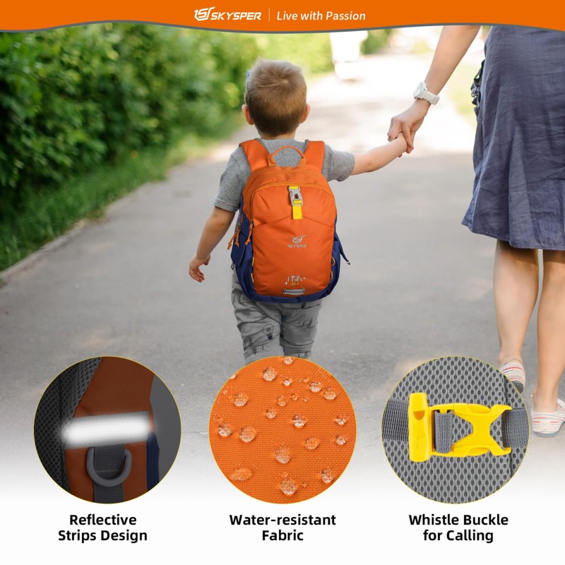 - Considerate Design: Reflective strips on the kids hiking backpack are helpful to alert safety in low light conditions. The chest whistle buckle makes it easy for the child to call out to their parents in need. The built-in name tag is inside the main compartment of the school backpack, write your child's name and it'll be his or her own cute backpack!