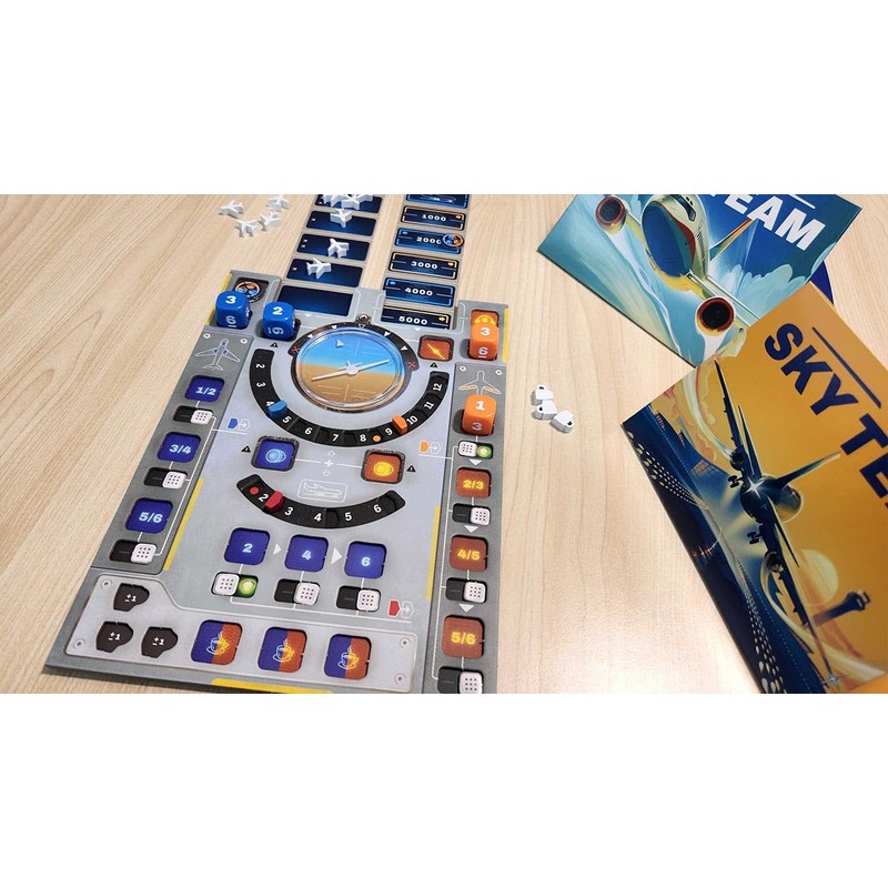 The Sky Team is a cooperative game for two players who alternately assign the result of dicing to various parameters of the aircraft in silent linking to optimize the airport distance, airplane speed, flaps, brakes, etc.