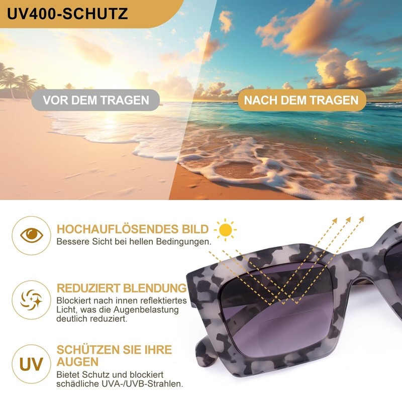 - UV400 protection: these bifocal reading sunglasses have 7 layers of coated protection. It effectively blocks harmful UVA and UVB rays and helps reduce eye damage caused by fatigue or bright light irritation and protects eyes in the sun.