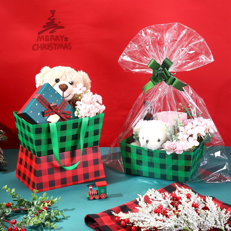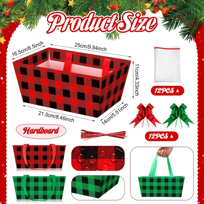 • Christmas Gift Basket Set: basket for gifts empty kit includes 12 Christmas empty baskets, 2 designs (6 for each design), with 12 plastic bags, 6 red pull bows, 6 green pull bows, and 12 twists; The accessories are sufficient to meet your Christmas gift packaging needs; These exquisite sets can add a touch of charm and warmth to your Christmas gift