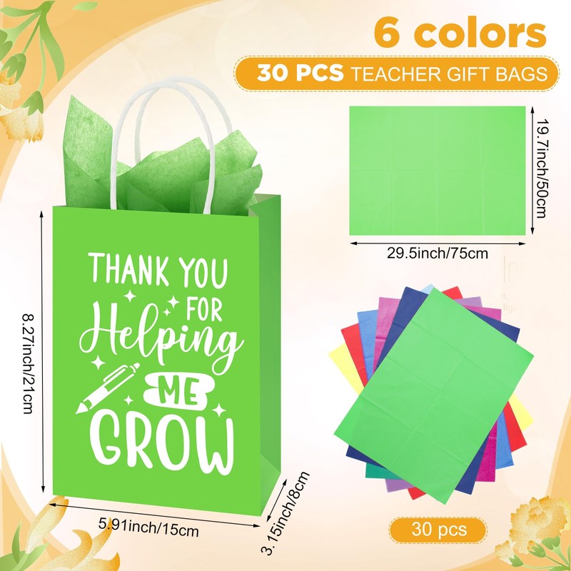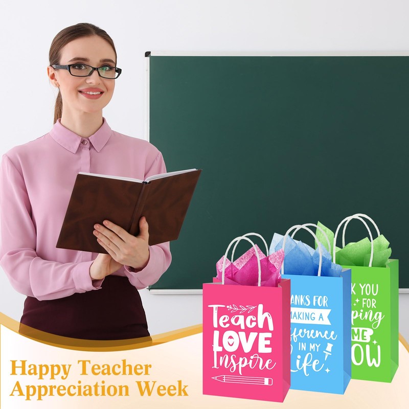 - More Ways to Show Appreciation: our package includes 30 teacher appreciation gift bags and matching tissue paper; With a plentiful supply, teachers, tutors, and educators of every kind can be showered with appreciation and love throughout the academic year