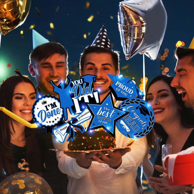 - Light up Graduation Decoration: our graduation stick set with string lights will definitely be the proper addition to your grad party centerpieces; Just use the glue points to attach the black and blue graduation tags to the sticks and insert them into the vase; The LED light (with batteries) will emit soft and bright warm light, which will go perfectly with black blue grad cards and instantly create a lively and festive atmosphere for the graduation party