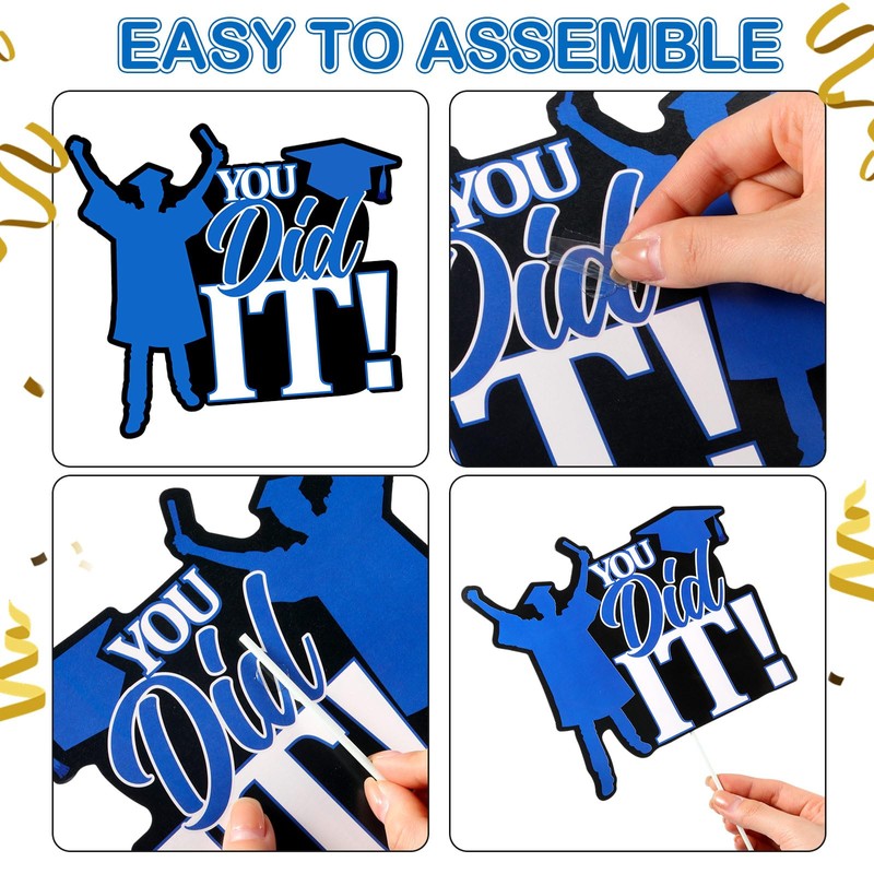 These 2024 graduation party table toppers include all tools you need, just simple use the adhesive dots to attach the black blue graduation cards and the fiberglass sticks together, and insert them into the vase. Easy to create charming and attractive graduation party decorations.