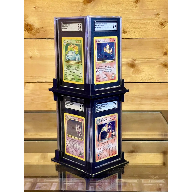 These stands hold 4 SGC standard thickness cards (35 pt). Single stands are for the bottom or top and hold 4 cards while the double stands allow you to stack! Single are the bases and doubles are for stacking. This is a (3) pack with one base and two double pieces for stacking. In total it would hold 12 PSA cards. No cards are included.