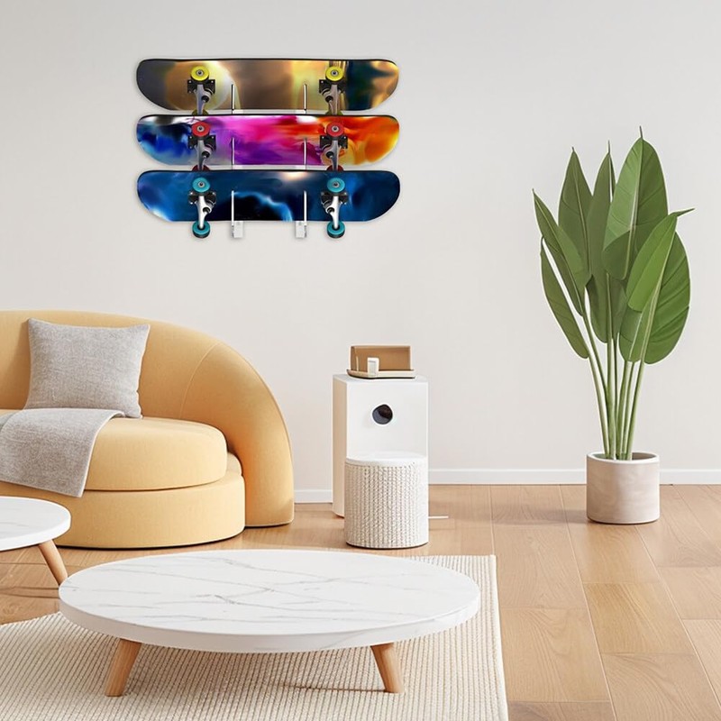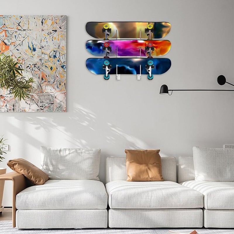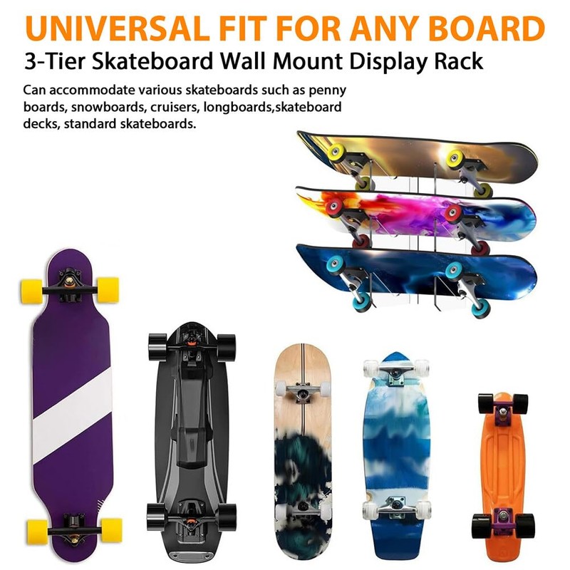Skateboard Wall Rack: This wall rack has a 3-layer design and can accommodate 3 skateboards at the same time. It can be used to store skateboards, longboards, surfboards, floating boards and more.