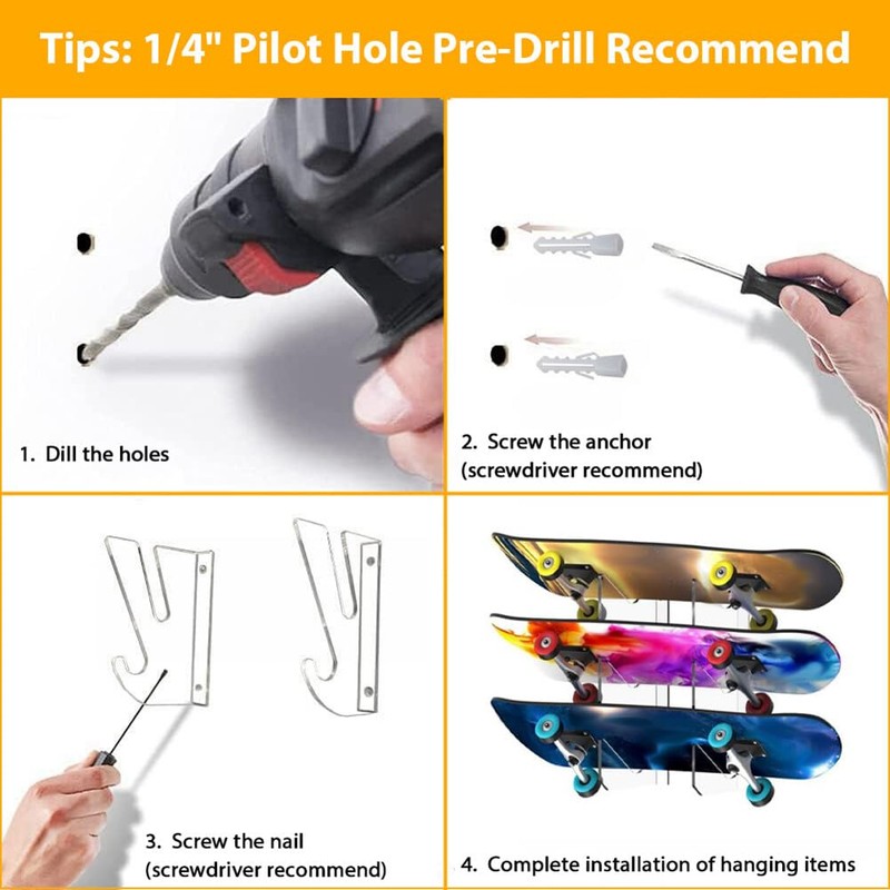 Easy to Install: This skateboard wall mount is easy to install. Simple and efficient. No complex steps and tools are required. After installation, it is firm and stable. High load capacity, not easy to fall off the wall.
