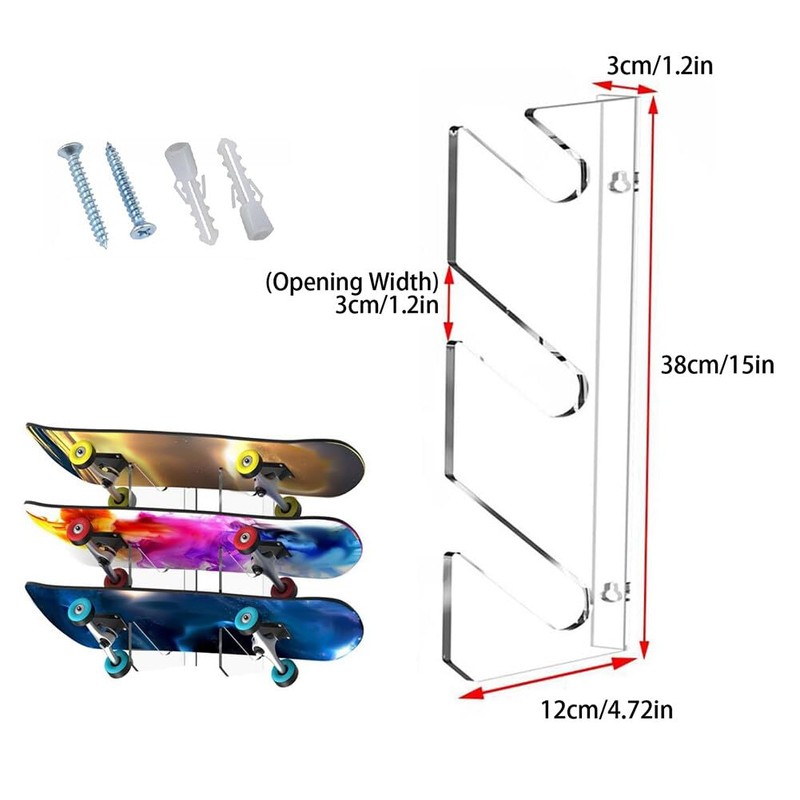 Slakerbe Acrylic Skateboard Wall Stand,3-Tier Skateboard Holder Transparent Wall Mounted Skateboard Wall Shelf Display Rack Hanger for Wakeboard Kiteboard Snowboard Longboard