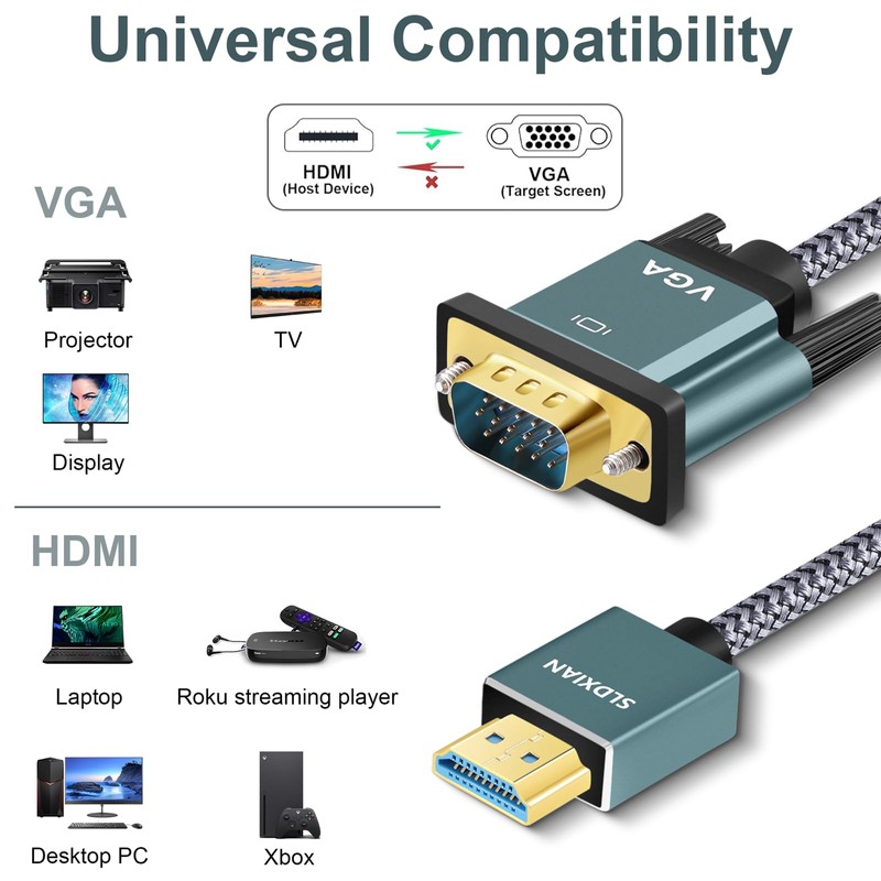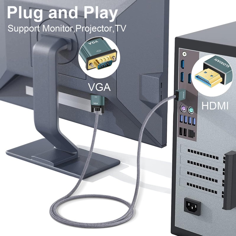 SLDXIAN HDMI to VGA (Male to Male) Cable, Aluminum alloy shell Nylon Braided & Gold-Plated Support 1080P Compatible with Computer, Desktop, Laptop, PC, Monitor, Projector (1M)