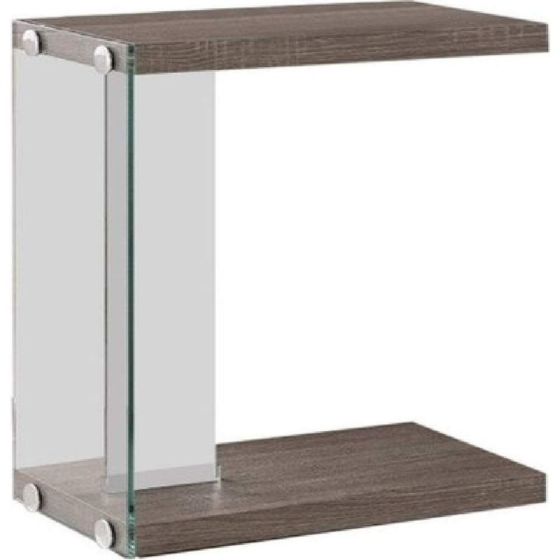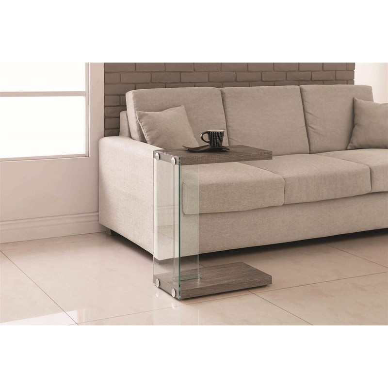 Add subtle elegance and maximum functionality to a living room with this weathered grey accent table. Also available in black and grey, this table is balanced with a dark top and base. Featuring a sideways U-shaped silhouette, the open frame easily slides in next to a sofa or chair for versatile functions. Enjoy your morning coffee or check your e-mails leisurely with the elongated rectangular top. The contrast between the clear side, shiny metallic, and warm wood transforms spaces.